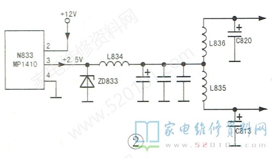 MP1410就是一只DC-DC降压稳压器,测量②脚电源输入端电压为12V,⑦脚EN(使能)端电压为3V,均正常。取下供电输出电感L836、L835后通电,L834的右端电压恢复为正常值+2.5V。断电后在路测量L836支路短路。经查,贴片滤波电容C820短路。换上一只10pF/10V的电解电容后试机,故障排除。