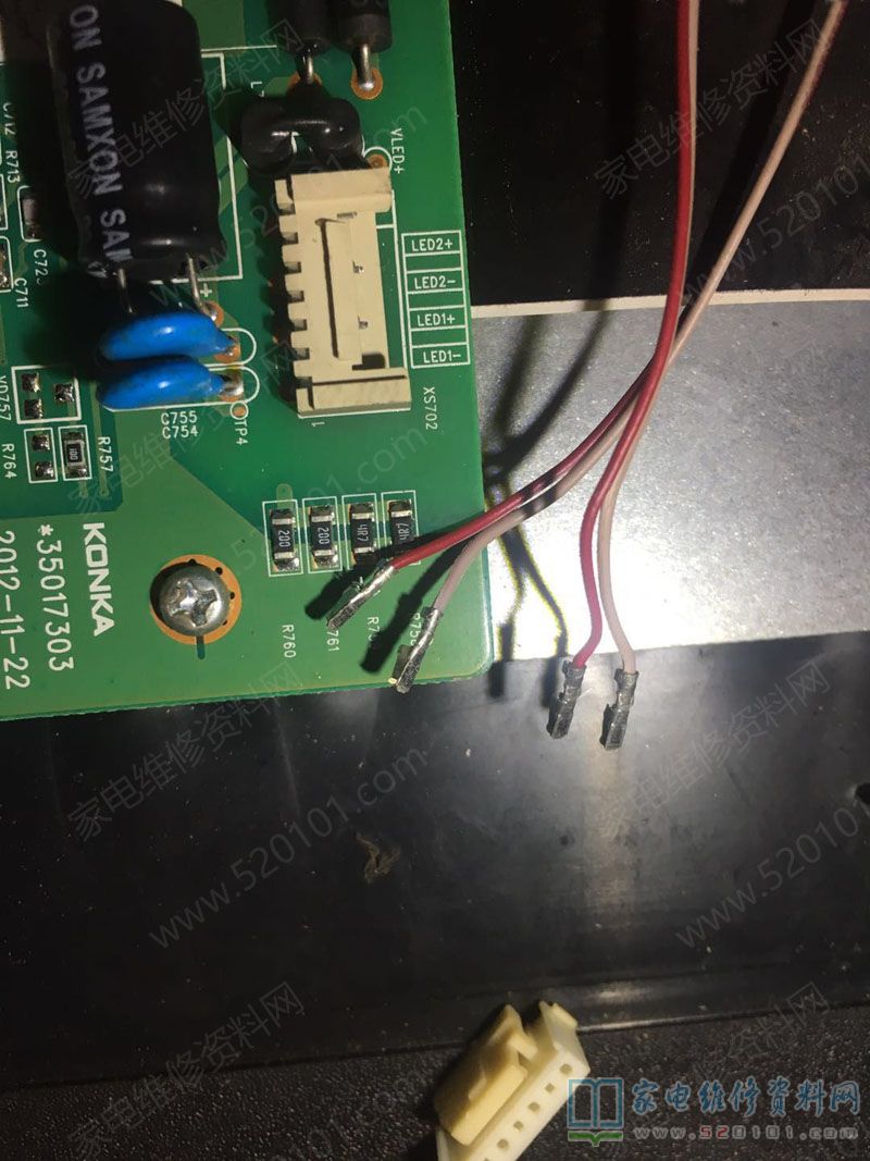 接修一台康佳LCD3253360CE液晶电视,故障表现为有声背光不亮,主板型号35017303,拆机拔下灯条,测量主板灯条瞬间电压有100V左右,该机空载电压应该在200V左右,经检测VD751短路,代换后灯条输出瞬间电压达200V,插上灯条插座开机背光还是不亮,用检测仪测量两组灯条两组均为正常72V,该机使用两组12灯灯条,外接两组72V灯条接上灯条正常点亮,以为原机灯条有损坏,开屏外接检测仪24灯正常点亮。线路正常,后取下XS702插头直接焊接在主板位置,开机背光成功点亮。