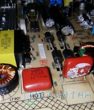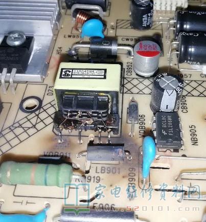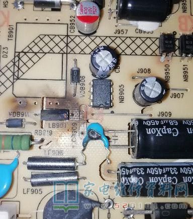 带回电源板仔细观察烧黑的位置,应该是短路引起。用万用表测变压器初级已经开路了,吸收回路没有异常,其他两组线圈正常,测LB901正常,测次级整流管没有短路,测 FSL206MR的6、7、8脚对地电阻约300多k,这个阻值不太正常,看到旁边有个小电容CB909,就拆下来一看,已经自暴自弃了,复测678脚对地电阻为数兆欧,看来这电容器应该是导致变压器烧黑的祸首了。我在厂里拆过不少开关电源,都是没有这个电容,这个容妹妹的牺牲,让我做梦都在想她的作用是啥,由于变压器初级已经有续流回路,FSL206MR由次级供电,所以一个大胆的想法产生了:变压器通过此电容充电,次级产生电压供给FSL206MR工作,这相当于是一个启动电容,想到了这,我不禁大喜。为了证实我的猜想,我把电路图发给几个设计过开关电源的同学请教,很快就被打脸了,他们一致认为这是Y电容,在此电路中没有她也能正常工作,既然如此,为保护变压器,那就不要了。现在的问题是变压器如何修复?看到初级和次级是分开槽位的,重绕初级不用拆完全部,那就绕。拆下变压器,用烙铁加热磁芯后无损分开,拆下线圈数得66圈,找出珍藏的电磁阀线圈,看着线径差不多就直接上了,绕好后在焊接铜丝的时候不小心摔地上,把磁芯摔断了,网上查了一下加点胶水就包起来了。修好变压器后再次检查主电路,发现整流后的两个电容CF901和CF902鼓包了,拆下测容量跟原来没差太多,核对图纸发现与图纸所标容量不一致,以实际为准吧,淘了几个回来换上通电,测5.1v电压为5.2V,PFC电压310V,从5.1V输出接1k电阻到PS-ON强制启动,另两路输出分别为11.8v和24v,pfc电压390v,万事俱备,就差装机了。