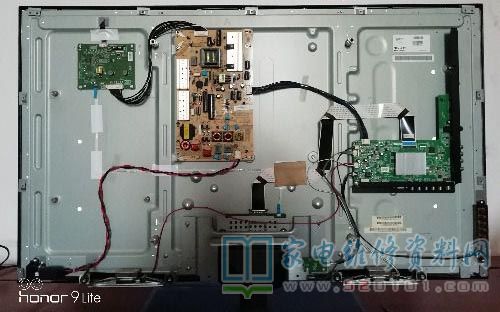后来选了个吉日再次来到丈人家,利用吃饭前的时间检查,第一次下手不知道要不要拆底座,猜测后盖跟底座可能会有干涉,干脆把电视放倒再拆,拆开后盖后才发现与底座无瓜葛,当时有点后悔把机器放倒,检查发现电源板上有明显烧黑的痕迹,先把板拆下然后盖子装好立起来,由于是单人操作,在放倒和立起来的过程中都听到手抓的地方发出声音,当时有点担心屏幕会因此残废,可能是因为太紧张,所以满身是汗。