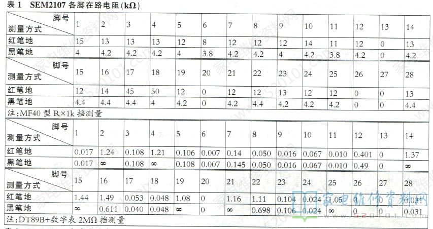 接修一台康佳LC40IS96N型液晶电视,故障表现为在收看中突然黑屏,伴音正常。查24V供电正常,背光开/关端电压为3.2V ,亮度调节端电压为2.8V,均正常。拆下背光板测量,发现Q310和Q322(复合场效应管4614)的①脚和⑦、⑧脚击穿,并把板上的两只7A保险烧断。更换损坏的元件后,用数字表在路测量各只二极管和三极管,未见异常。试机,听得背光板上“啪”的响了一声,背光灯不亮。关机后查得Q322、Q304、Q305、Q306和Q310五只4614均烧坏,将背光控制芯片SEM2107及损坏元件更换后试机,一切正常。这时测得SEM2107的各脚在路电阻见表1。