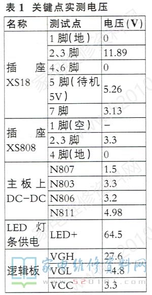 接修一台康佳LED 55IS988PD型液晶彩电,开机后屏显“康佳智能电视启动中”,一直无变化,如图1所示。重复开/关机,有时红灯变绿灯,黑屏。分析检修:拆机,检测主板供电排插XS18各脚电压,除⑤脚有5.2V供电外,其余各脚电压均为0V;PFC电压滤波电容CF919、CF913店( 68uF/450V)两端电压为300V,判断PFC电路没有工作。先刷机升级,无效,怀疑主板有故障。该机主板型号为35016422(图纸),主芯片为MSD61982BX(BGA封装)。能开机时背光和屏能正常亮起,应是读取程序未通过,先在存储器N501~N503表面涂上焊膏,然后放到红外加热台上,下温为180°C,上温为260°C,加温补焊,最后用洗板水清洗干净,并在主芯片表面涂上硅脂,做好散热处理。上电试机,图声正常,故障排除。正常时,测得该机关键点的电压如表1所示,供参考。
