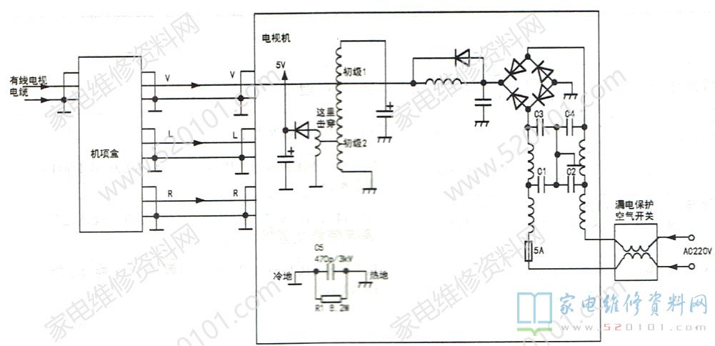 接修一台康佳LED55IS95D型液晶彩电,只要接通该机的电源开关,用户家中的空气开关就要跳闸。引起空气开关跳闸的原因一是负载过流,二是用电设备漏电。该机功率仅100多瓦,即使电源板有短路现象,也应先烧断机器里面的5A保险丝,不至于引起空气开关跳闸。该机电源插头采用两脚插头,并没有接地线,自然不存在漏电跳闸这一现象。该机的市电输入电路如图1所示,热电和冷电之间的隔离电容C5和电阻R1,电源进线处的抗干扰电容C1~C4,这几个元件一端接冷地、 一端接热地。测得电源插头引脚和电视机高频头外壳(冷地)之间的电阻仅为1k2,这说明冷热地之间某元件漏电,AC220V供电的一部分电流将通过机顶盒的AV线接地端,再通过有线电视的高频电缆接地端流入大地,当漏电电流达到漏电保护器的动作值(一般为30mA)时,漏电开关跳闸。检查R1及C1~C5都正常,采用分段断开法检查,发现副电源的开关变压器初级和次级绕组击穿。