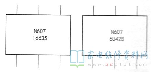 接修一台康佳32F1160CF型液晶彩电,雷击后能正常开机,字符正常,但输入AV信号屏显“无信号”。该机AV输入与分量口的γ信号共用一个端口(绿色)。拆机发现,该机采用AV输入信号与主板上的N607直接相连。N607 是一块6脚贴片IC,表面印字为“16635"如图1所示。判断N607雷击损坏。由于不知道该IC的型号,无法购到此IC。最后从一台屏坏的康佳LED32F1100CF型液晶彩电主板上找到N607 ,但印字为“6U428”。根据线路分析,判断该IC与故障机上的N607功能相同。于是拆下换到故障机上,试机,故障排除。