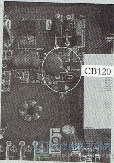 接修一台康佳LED32F360C型液晶电视,上电后电源指示灯不亮,不开机。拆开机壳,目测电源三合一板(板号TP.VST69D.PB765)上无明显异常损坏的元件。在路检测,发现保险丝FB1(3.15A/250V)巴熔断,主滤波电容EB1两端正、反向阻值约为900Ω,明显异常。取下整流二极管DB1~DB4( H69XX )及开关管QB101(1K5P65W)检测,均正常。接下来检查尖峰电压吸收电路,发现高压吸收电容CB120( 472/1kV )短路,如图1所示。换新CB120和保险丝后,再用万用表电阻挡测主滤波电容EB1两端正、反向阻值恢复正常。通电试机,电源指示灯亮,按下“待机”键,光栅出现,图像、伴音均正常,故障排除。