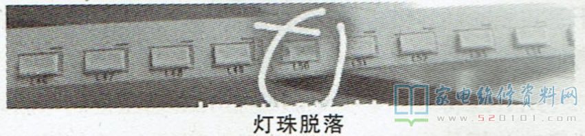 接修一台康佳LED42M1200AF型液晶彩电,开机后屏一闪即灭。打开后盖,观察主板没有异常现象。找来- 个同型LED灯条插入主板灯条供电插口上开机,灯条亮,说明本机恒流驱动电路正常,故障原因是屏内背光灯条有问题。小心地拆开液晶屏,发现灯珠L50脱落,如图1所示。去掉灯条连接排线,用壁纸刀把灯条从灯条散热片上割掉(注意:不要把粘灯条的双面胶给破坏了,否则换新灯珠后难以复原)。
