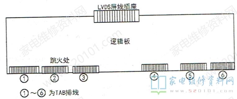 拔掉主板上屏线,直接从电源板上引入+12V电源接在逻辑板上CP46两端(正负极勿搞错),而且在12V正极引线上串接一无锁开关。通电后间歇点触开关,只见逻辑板与屏连接的第二组TAB排线中有火花闪现,如图1所示。连续冲击几次,火花再未出现,这时测得vGH处的电压已升至+22.7V,判断CM501已进入正常工作状态。