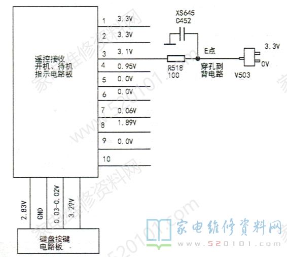 由于过孔的另一面线路被元件覆盖,铜箔上又涂有较深颜色的绝缘漆,因此难以找到过孔的后续线路。考虑到该处过孔漏电轻微,对3.3V供电分流微不足道,于是用一根导线将①脚的3.3V供电接到E点,使E点电压保持在3.3V。试机,图像、声音一直正常,仅按键失效。如果要按键有效,也可以外安装一只开关,操作键盘时将连线断开,调好项目后再闭合开关,使E点电压保持在3.3V即可。