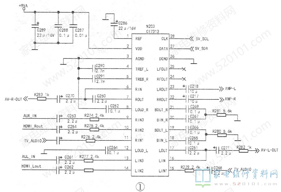 因音效块的功能比较简单,同时左右声道都无声,所以只需检查以下几个关键引脚:①脚,REF基准电压,4.23V;②脚,VDD供电,8.50V,27脚,15.32V;28脚,15.90V。从测量结果可以看出,27脚、28脚总线电压明显异常。因为本集成块供电才8.5V,而这两脚电压居然高出了供电电压。从电路图上标注看,27脚为DATA,接5V_ SDA信号,28脚为CLK,接5V_SCL信号,这两脚电压不应超过5V。