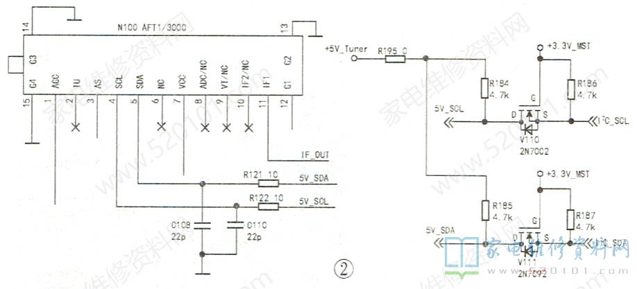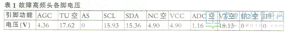 CT7313与高频头的DATA、CLK两脚各通过一只10Ω的电阻相连,同时DATA、CLK各通过一只4.7kΩ上拉电阻接到5V高频头供电端5V_Tuner,如图2所示,通过一只场效应管2N7002(丝印 12W)完成电平变换,将主芯片MST721发出的3.3V电平的I2C_SDA、I2C_sCL变换成电平为5V的5V_SDA、5V_SCL总线信号。检查5V_Tuner、FC_ SDA、PC SCL电压均正常,而CT7313自身供电才8.5V ,也不可能使其他引脚电压升高到接近16V。这路总线上面挂载的还有一个是高频头,测高频头各脚电压见表1。