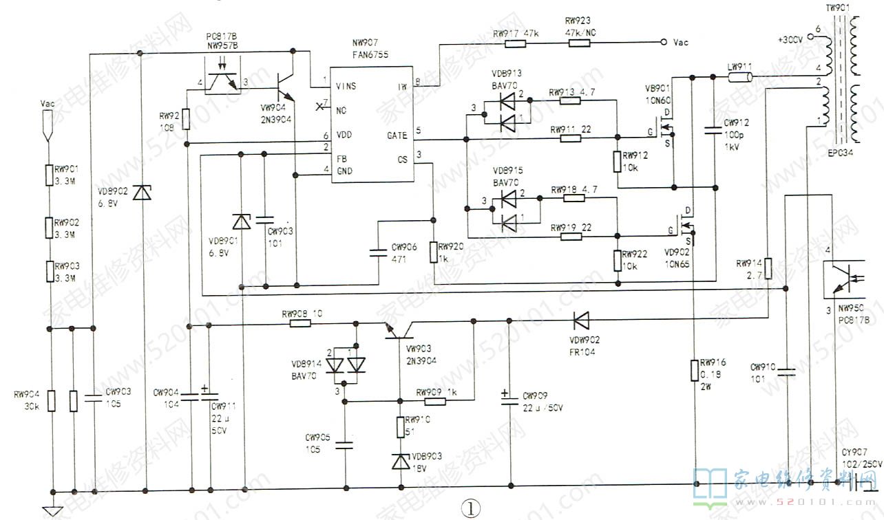该机开关电源初级电路如图1所示。测量电源管理芯片NW907( FAN6755)的⑧脚电压298V,正常;但⑥脚(供电脚)电压在6.8V~15.6V波动,正常值应为16V。芯片损坏的故障造成⑥脚电压不稳较常见,但更换FAN6755后开机还是不行。检测开关变压器的②脚通往FAN6755的⑥脚的元件,发现CW911(22uF/50V)已无容量,换新后开机,故障排除。