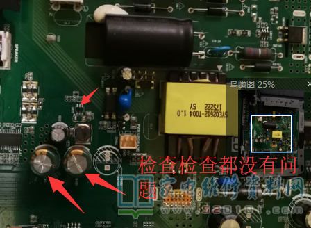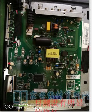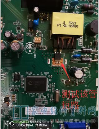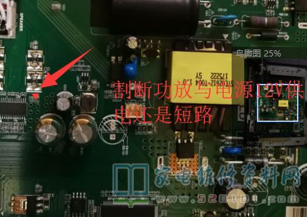 目测倒是没有怎么动过,目测没有明显烧坏的地方,谈好费用,检查:保险完好,测输出,只有背光电源有一定的电压,12V没有输出。测试12V对地电阻短路,心中暗喜,直接测试整流二极管,短路,焊下,二极管正常。 看来问题没有想象的那么简单。测试小电源稳压并没有发现短路的。查找没有对应的图纸。只好延着电路板慢慢测试,于是使用最老的办法,割断相关负载连接,测试12V供电对地,还是短路,奶奶的,见鬼了,拆掉几个三端稳压,还是短路 ,想烧鸡,可是没有合适的电源,想使用电瓶,又怕电流太大,烧的西趴烂,反复测试主芯片,没有明显的短路,唯一伴音,割断了供电端,还是短路,于是把周边滤波电容全拆了,测试都没有问题。但是电路板还是短路,见鬼了难道是电路板漏电短路不成!没有办法,没有图纸,看来只有参照相关IC的引脚功能查找相关电路结构了。于是找到伴音功放的相关资料,奶奶的,是两路供电,我之前只割断一路。有了资料就好办多了,查找伴音IC另一供电外围,终于有了重大发现,一贴片电容击穿。