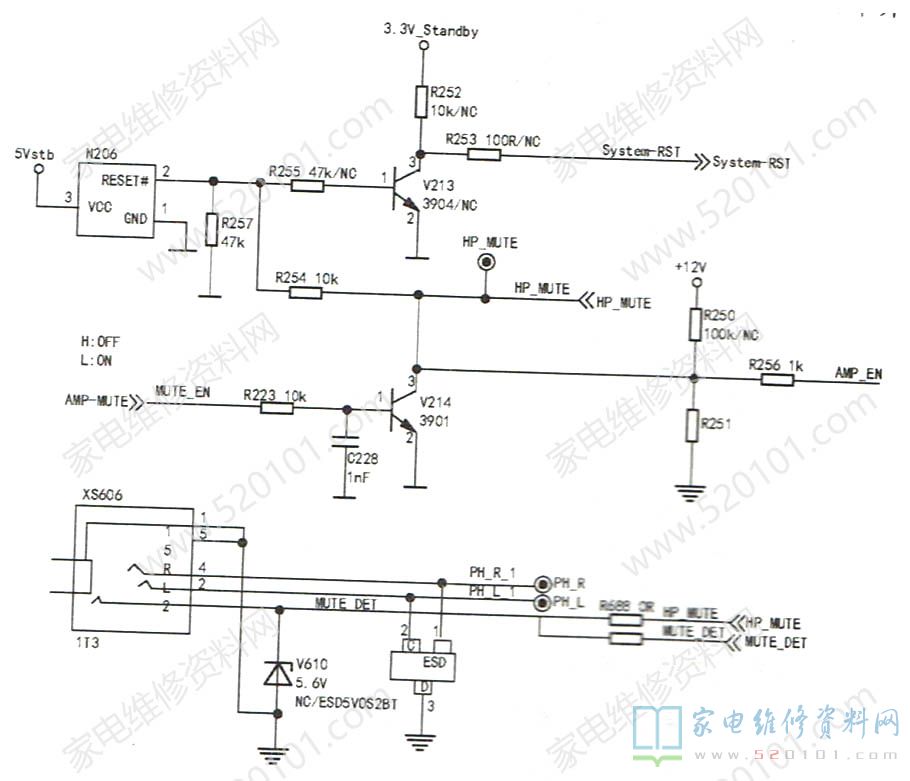 接修一台康佳LED50M6180AF 2BOM型机(6A800C 平台,板号为35019879),故障表现为无声。开机测得插座XS201的输出电压为0V,再测伴音功放MSH9010左、右声道输入电容C210、C225的输入端电压为1.5V, 正常;④脚(AVDD)5V电压正常,⑤脚(静音脚,EN )电压为0V(已静音)。转向检测静音电路, 如图1所示,测得V2/4b极电压为0V(正常),c极电压却为0V,正常时应为高电平。经查耳机静音外接稳压二极管VD601短路,换新后伴音正常。另外,N206也为常坏件,会造成静音电路无供电而无声的现象。