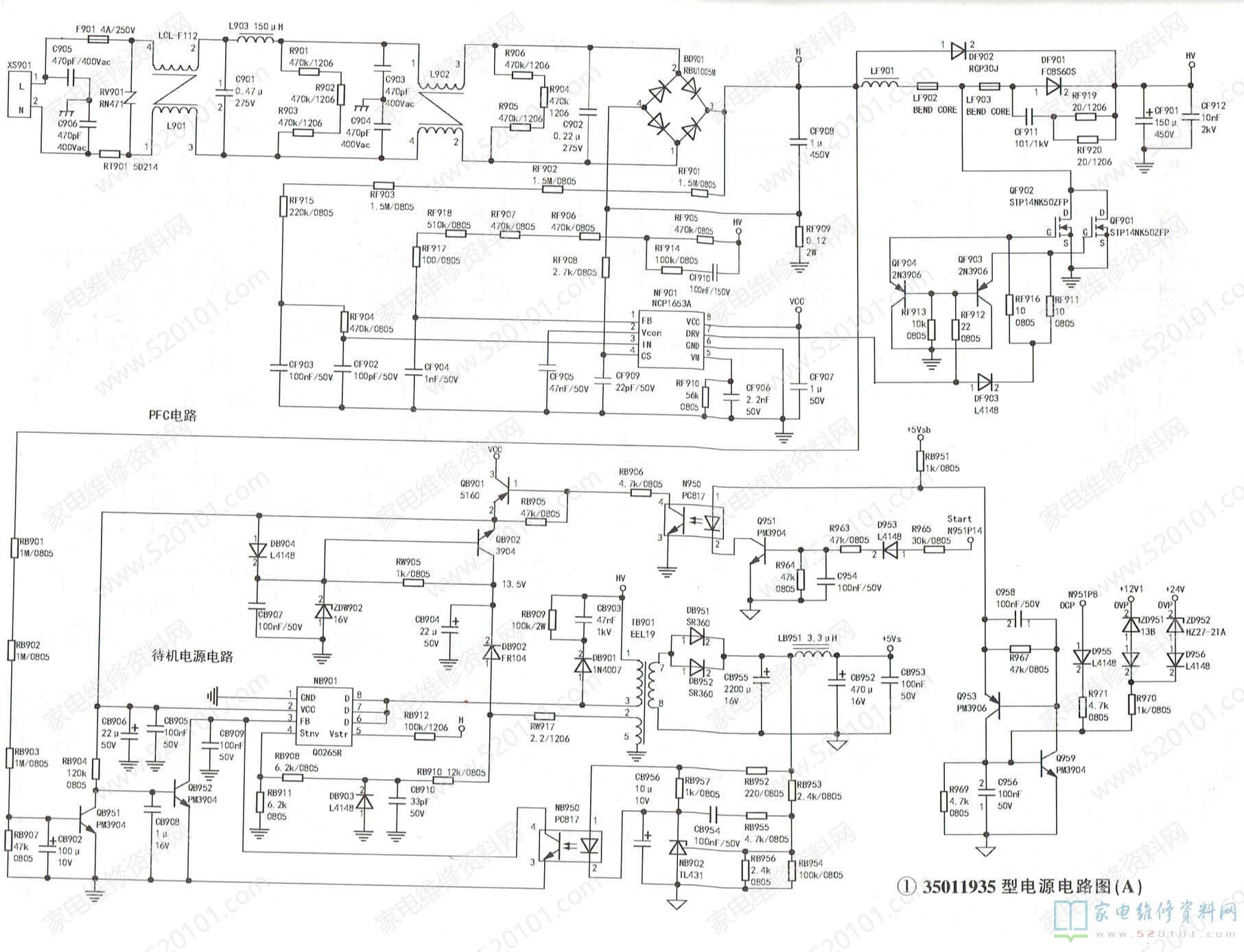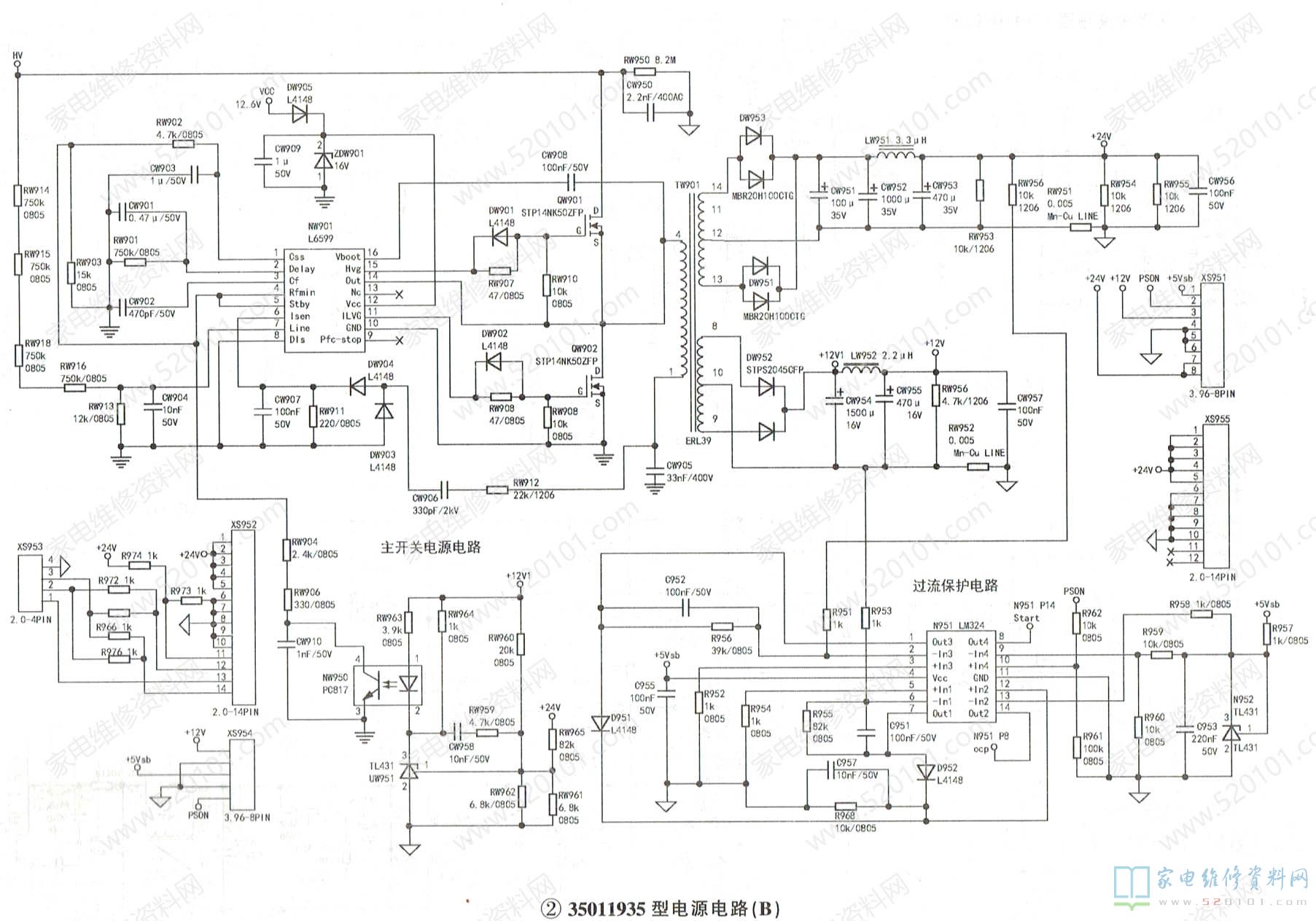 35011935电源板主要用于康佳LC37DES3OC、LC40GS60DC等型液晶彩电中,其电路如图1、图2所示,主要IC的引脚功能与实测数据见表1~表4。
