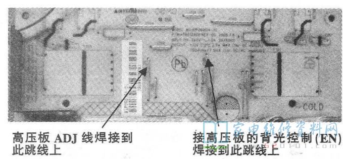 然后把万能高压板插件上的线对应接到原板上,可以直接焊接到原板xS701尾插座处,XS701插座从左到右数:①、②脚电压为12V,③脚EN,④脚DIM,⑤、⑥脚GND;也可以就近查找接入,万能高压板供电12V和GND直接接到C704电容两端,万能高压板上的N/F直接焊接到J709(EN)跳线上,万能高压板上的ADJ直接焊接到J713(DIM)跳线上,如图2所示,接好后通电背光亮,图像恢复正常。