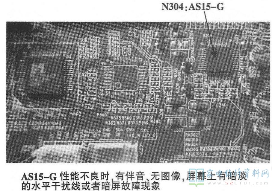 提示:AS15-F是逻辑板上常用的芯片,AS15-F和AS15-G是可以直接互换使用的。AS15-F不良还会引起图像负像、灰屏、暗屏等故障。需要特别提醒的是,有时刚开机时正常,几分钟后屏幕发白,无法看清图像,是这款电视AS15-F芯片损坏引起的通病。
