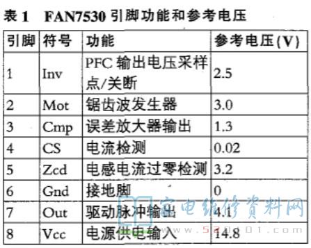 FAN7530是PFC功率因数校正电路专用集成路,它的工作频率可根据需要设定调整,本电源设定最低工作频率是27kHz,其引脚功能和对地参考电压表1。
