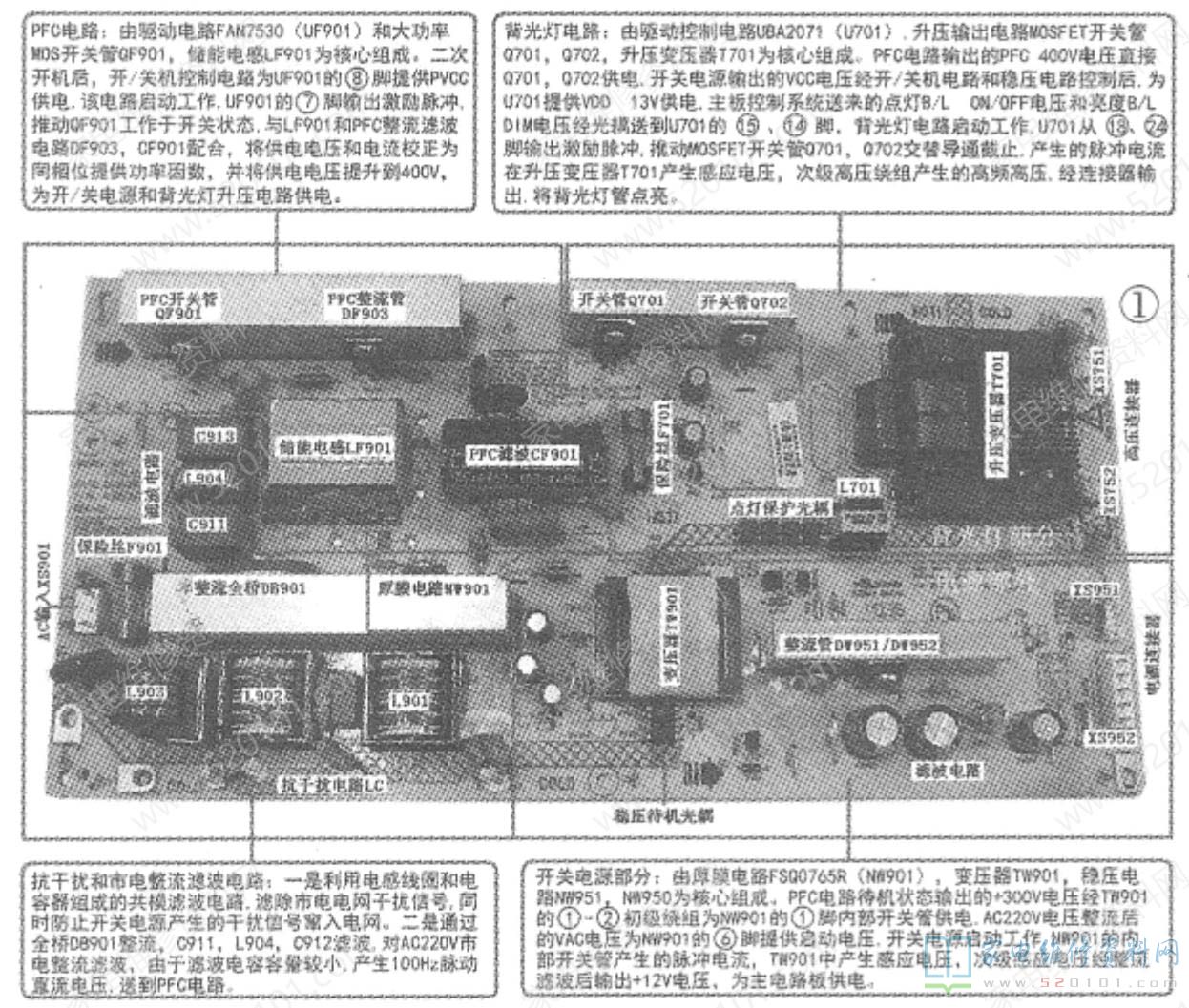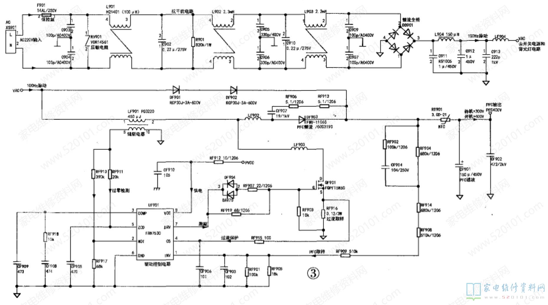 PFC电路见图3所示,该电路主要由驱动控制电UF901 (FAN7530)、 储能电感LF901、MOS开关QF901、PFC整流滤波电路DF903、CF901等元件组成。