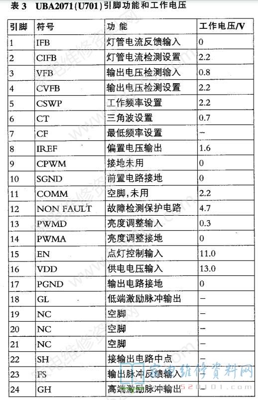 UBA2071是nxP半导体公司生产的cCFL背光灯驱动控制检测电路,引脚功能与工作电压见表3。