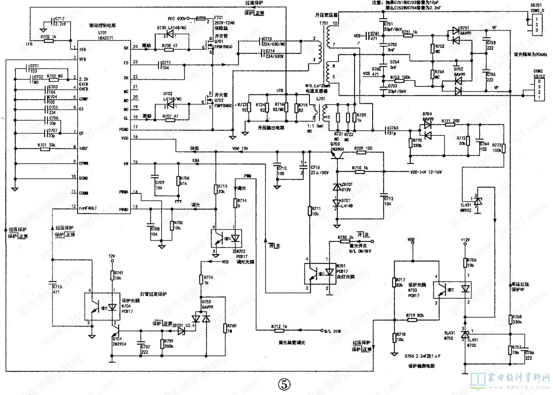 背光灯电路如图5所示,它由驱动控制电路UBA2071(U701 )、MOSFET开关管Q701、Q702、升压变压器T701为核心组成。