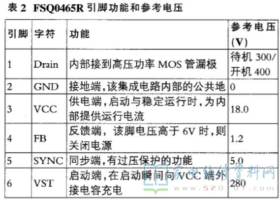 FSQ0465R是PWM控制芯片/MOSFET大功率场效应管的复合电源芯片,它的引脚功能和对地参考电压见表2所示。