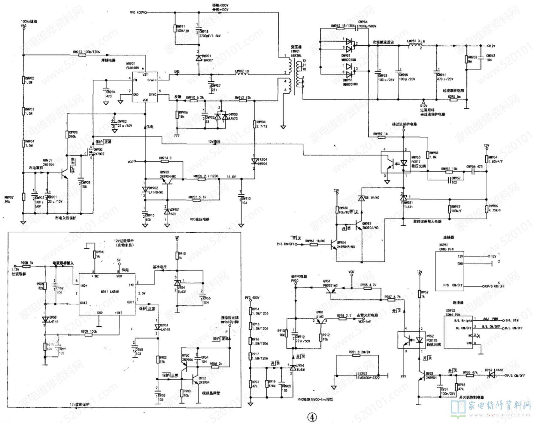 开/关机控制电路见图4的右下角所示,由Q953、光耦N952、Q951为核心的PVCC控制电路和以Q901、误差放大器U954为核心的vCC-Inv控制电路两部分组成。