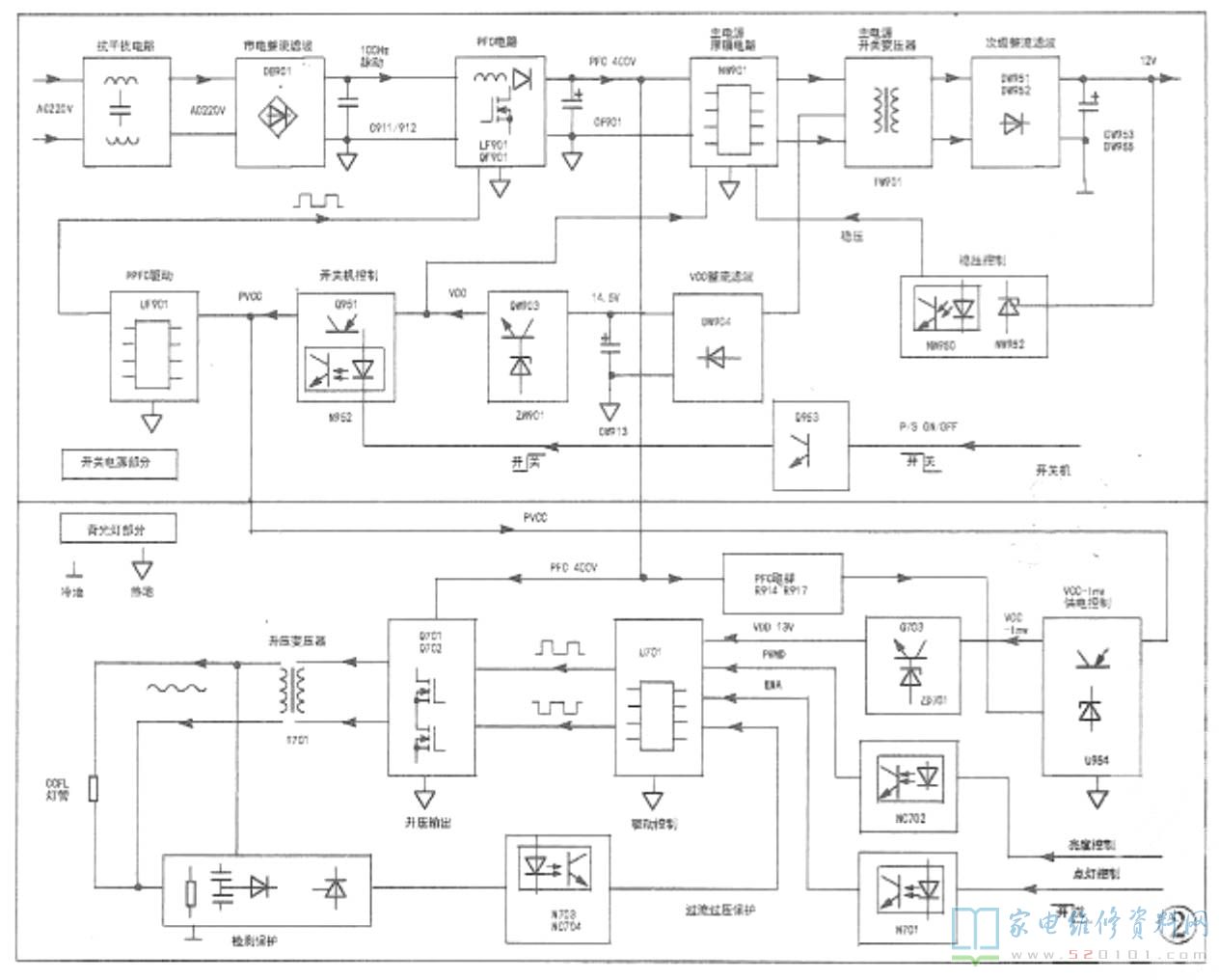 例2:开机三无,指示灯不亮。分析检修:检测电源板无12V输出,判断故障在电源电路中。测量CF901两端电压为300V ,说明市电整流滤波正常;测量nw901的⑥脚无启动电压,经查⑥脚外部启动电阻RW913开路,更换后,开关电源有电压输出,但测量CF901两端电压仅为300V,说明PFC电路未工作。测量PFC驱动电路UF901的⑧脚无PVCC电压输入,而测量连接器的P/SON/OFF电压为高电平,判断故障在开/关机控制电路。经查Q953的集电极为低电平,正常,而光耦N952的输出端为高电平,判断N952内部开路,更换N952后,测量CF901两端电压上升到+400V ,故障排除。