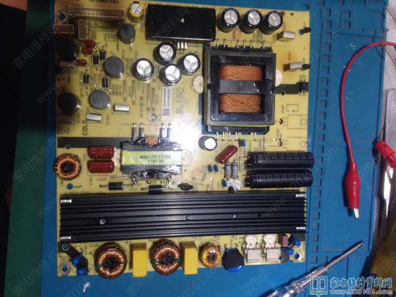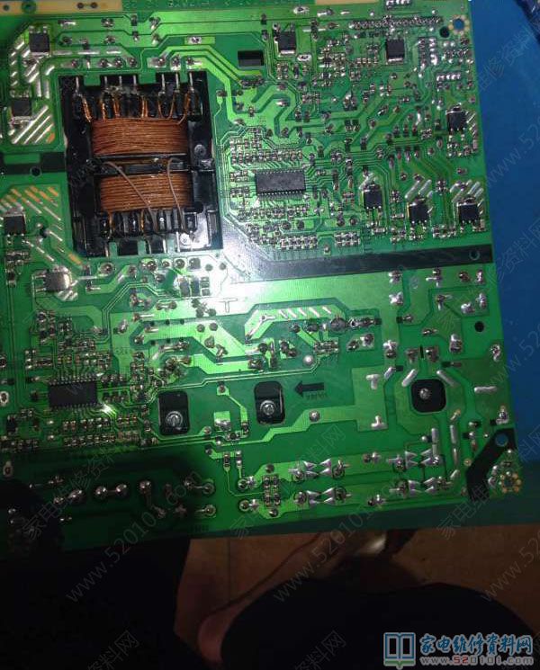 接修一台康佳LED55K36U液晶电视,平时就是用遥控器把电视关了,没有拔掉电源插头,有一天把插头都拔掉后再使用的时候开不了机,待机指示灯没有亮,三无。上门开盖检查,+5VSB没有待机电压(电源板号TV5502-ZC02-01),量整流桥输出电压为320V,大电容电压为330—360V之间跳变。现场查无果,摘板带回维修部继续修理。