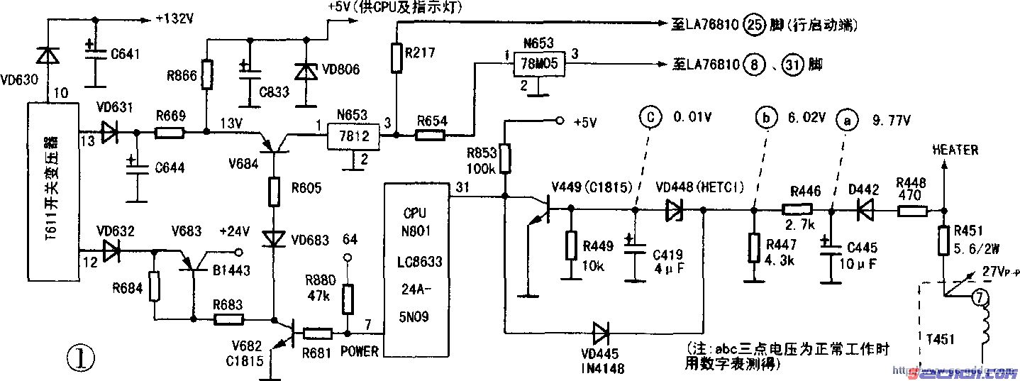 1.“灯丝”过压检测电路由三极管V449、稳压管VD448、整流管D442等元件组成。电视机正常工作时,行输出变压器T451⑦脚输出27V电压,它通过D442、C445整流滤波后,在图1中的a、b、c点分别形成9.77V、6.02V、O.01V(数字表实测)的直流电压,此时三极管V449处于截止状态,31脚为高电平(5V)。