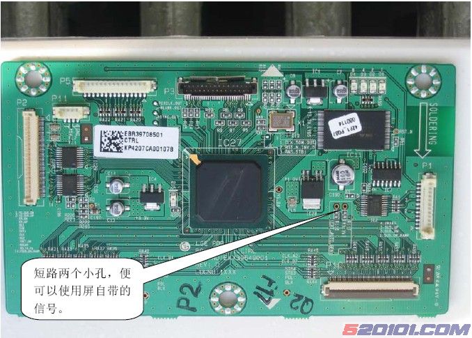 2.利用屏自身发的信号来判断屏本身的好坏。如下图:R17 和R18 附近各有一个小孔,在R118 的附近写有EXT-AUTO-GEN ,意思是本屏内含的信号发生器,需要用导线短路这2 孔。目的是让R118 置于高电平。利用内部的彩条信号和运动信号来判断屏的问题具体请见下图描述: