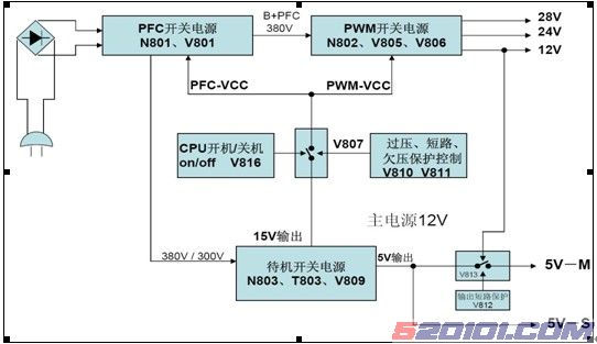 部分振荡集成电路的VCC供电,+5V一路作为CPU系统控制5V_S,另一路作为小信号前端供电5V_M。在开机和待机状态(on/off),由CPU 发出指令控制V807 地切断/接通,PFC 部分和