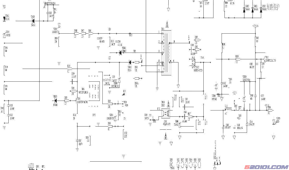 4、5V输出:由T803绕组#6脚~#10脚输出,经VD812整流,C842、C843、L811滤波产生+5V_S,+5V_S经过V813、V812控制后产生+5V_M输出。