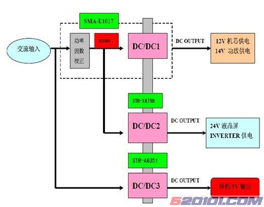 电源部分由三个相对独立的电源组成:待机电源、小信号部分主电源、背光灯部分主电源,其流程如图所示: