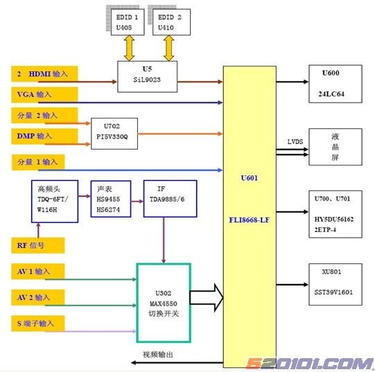 外部视频信号(AV1、AV2)、S端子先输入到切换开关U302(MAX4550)中进行切换,再送到主芯片U601(FLI8668)内解码、画中画处理,输出视频信号。