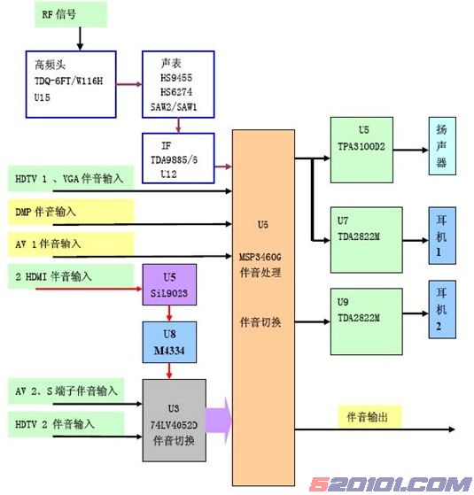 外部输入的HDMI信号先输入到U407(SiL9023)进行处理,输出24位RGB图像信号到FLI8668,在其中做scaler变换和相关处理后输出;I2S声音信号先到CS4334数模变换后,再到4052D切换,最后送入MSP3460G处理后,在功放中输出。