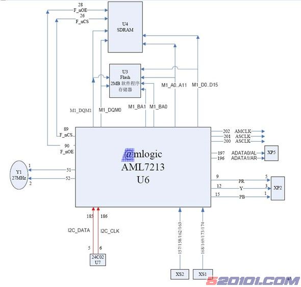 XU801的#26脚、#28脚、#11脚分别与U601的#AD24脚、#AC25脚、#AC26脚相连,进行片选以及程序的读写控制,寻址和数据传输则分别通过22 位的地址线和16位的数据线来完成。系统开始工作时,芯片U601通过16位数据线将闪存中的程序读到U601中的RAM中运行;由于闪存是可擦写的,所以本机芯片无需掩膜,只需在生产前用烧码器将程序烧入闪存XU801。另外,还可以由计算机通过U601(FLI8668)的通用异步收发器(UART),直接将程序写入闪存XU801内,实现软件的升级。