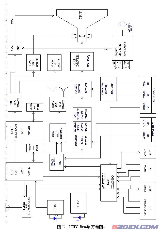 由HD接口板进入的RGB和YpbPr高清信号经视频开关N6 M52756切换,进入TV板N301 M52348视频开关与电视信号切换后到CRT板预放大电路N402 TDA4886 处理后送入末级视放TDA6120,放大后供CRT显示。