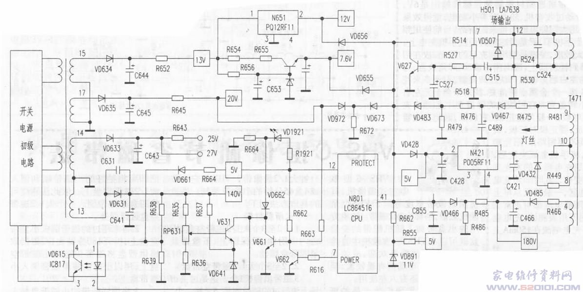 待机或保护时CPU⑦脚输出低电平,V662截止,V661饱和导通,通过光耦VD615(PC817)将开关电源振荡激励信号短路,开关电源停止工作,进入待机状态。同时由于V661饱和导通,指示灯通过VD662构成回路,流过指示灯的电流增加,指示灯亮度变亮。