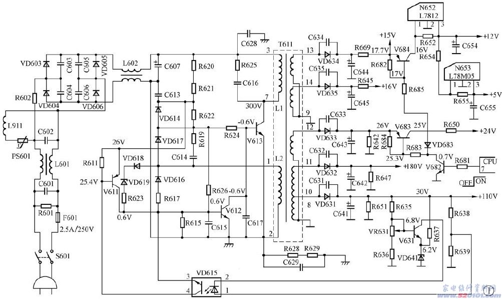 开关变压器12输出的脉冲经VD633整流,C643滤波后,得到+24V电压,经电子开关V683后,送至场输出电路及行推动电路,作为它们的供电电源。
