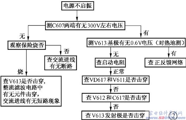 这种情况说明电源不启振,可按图2所示的流程进行检修。